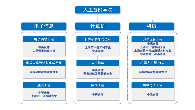 人工智能学院历经二十载发展,形成八个本科专业协同共进的格局,紧密对接国家战略与产业前沿。其中人工智能、集成电路设计与集成系统等核心专业深度融入四新建设框架,汽车服务工程、通信工程、计算机科学与技术等上海市一流本科专业彰显办学实力,电子信息工程、网络工程等专业构建国际化育人平台,机械电子工程专业聚焦机器人技术人才培养。现有在校生1645名,形成由占比53%的高职称教师为教学主力,协同20余位上海交通大学、同济大学等名校专家的教研深度融合的双导师育人方阵。