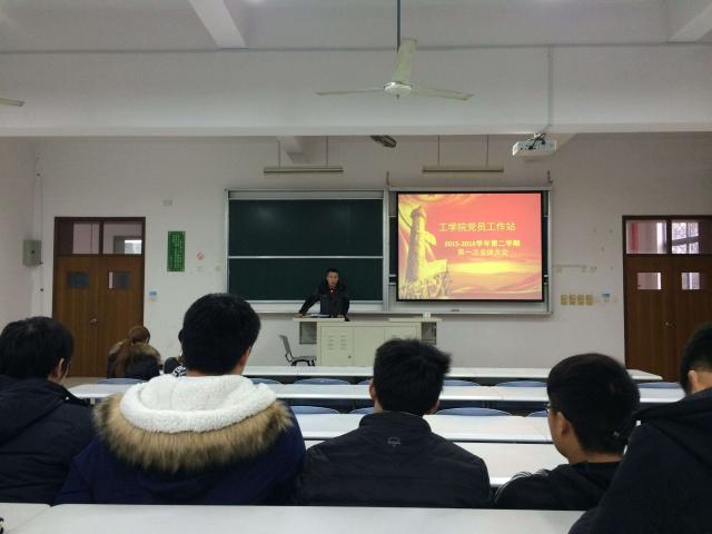 2016年3月9日下午16点30分工学院党员工作站于日阶201召开2015-2016学年第二学期第一次全体大会。本次大会由党总支副书记赵科主持,党员工作站组织部负责人唐佩琳、纪检部负责人权有良以及全体党员工作站成员参加。