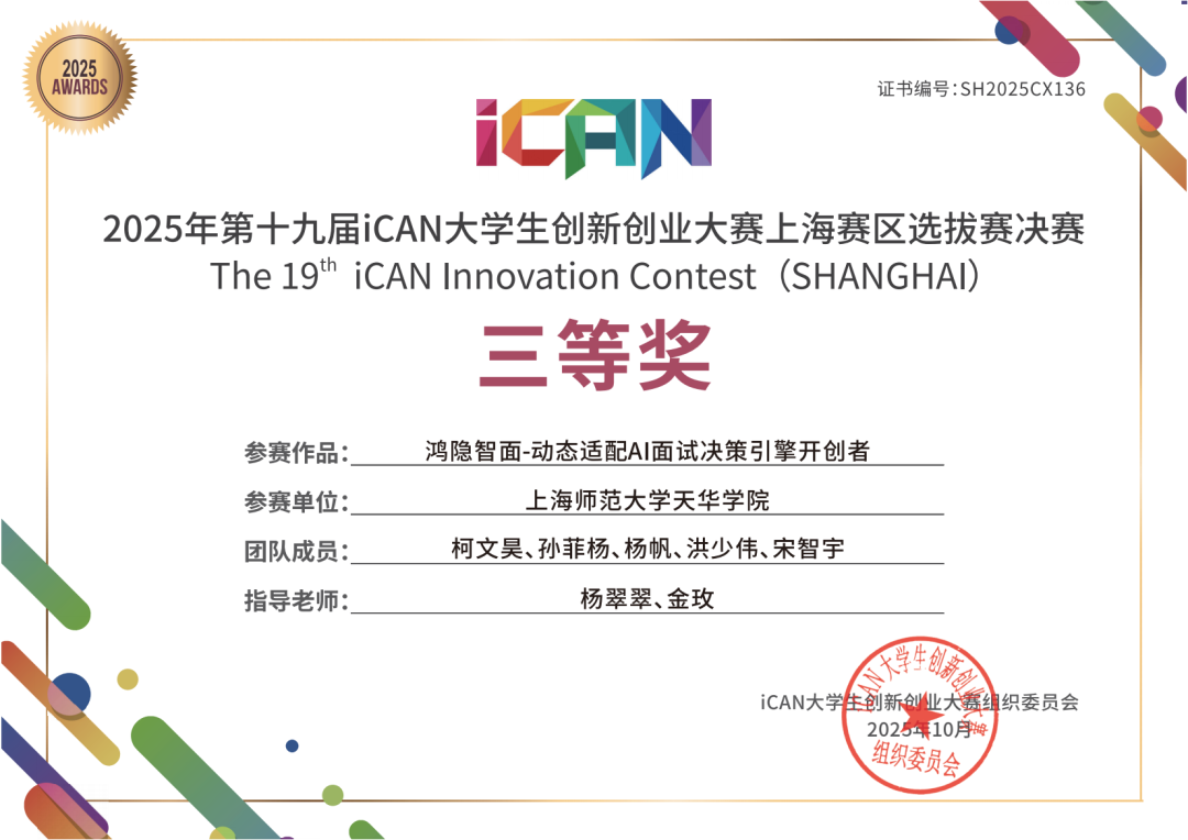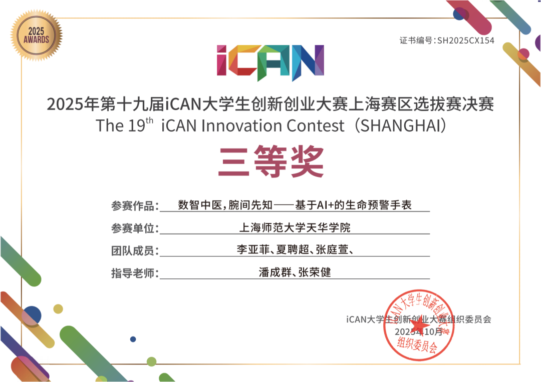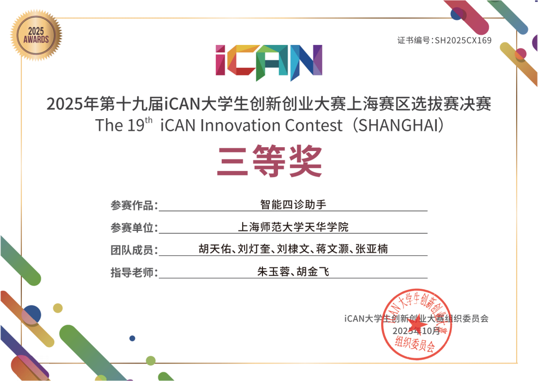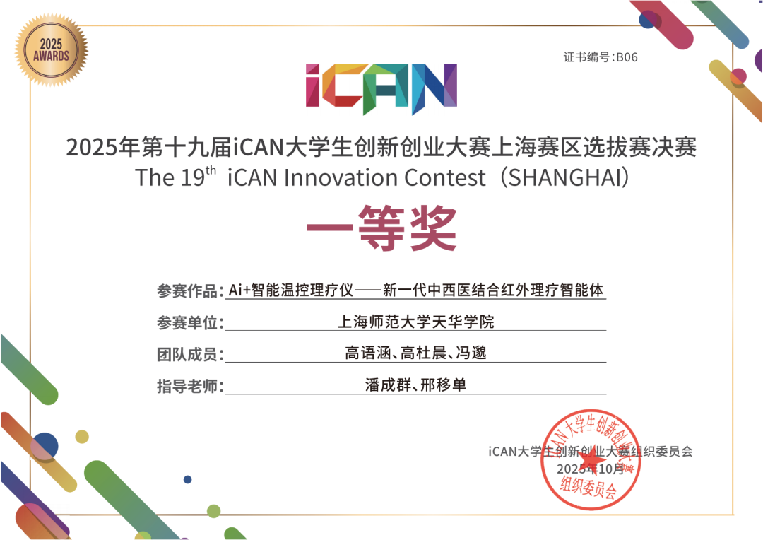 在这场强手如云的角逐中,上海师范大学天华学院人工智能学院参赛团队发挥出色,多点开花,最终斩获多项佳绩!其中,由潘成群、邢移单老师指导,高语涵同学担任队长的“AI+智能温控理疗仪——新一代中西医结合红外理疗智能体”团队,凭借融合人工智能与中西医理疗理念的创新方案,一路过关斩将,荣获一等奖,成为赛场上一大亮点!