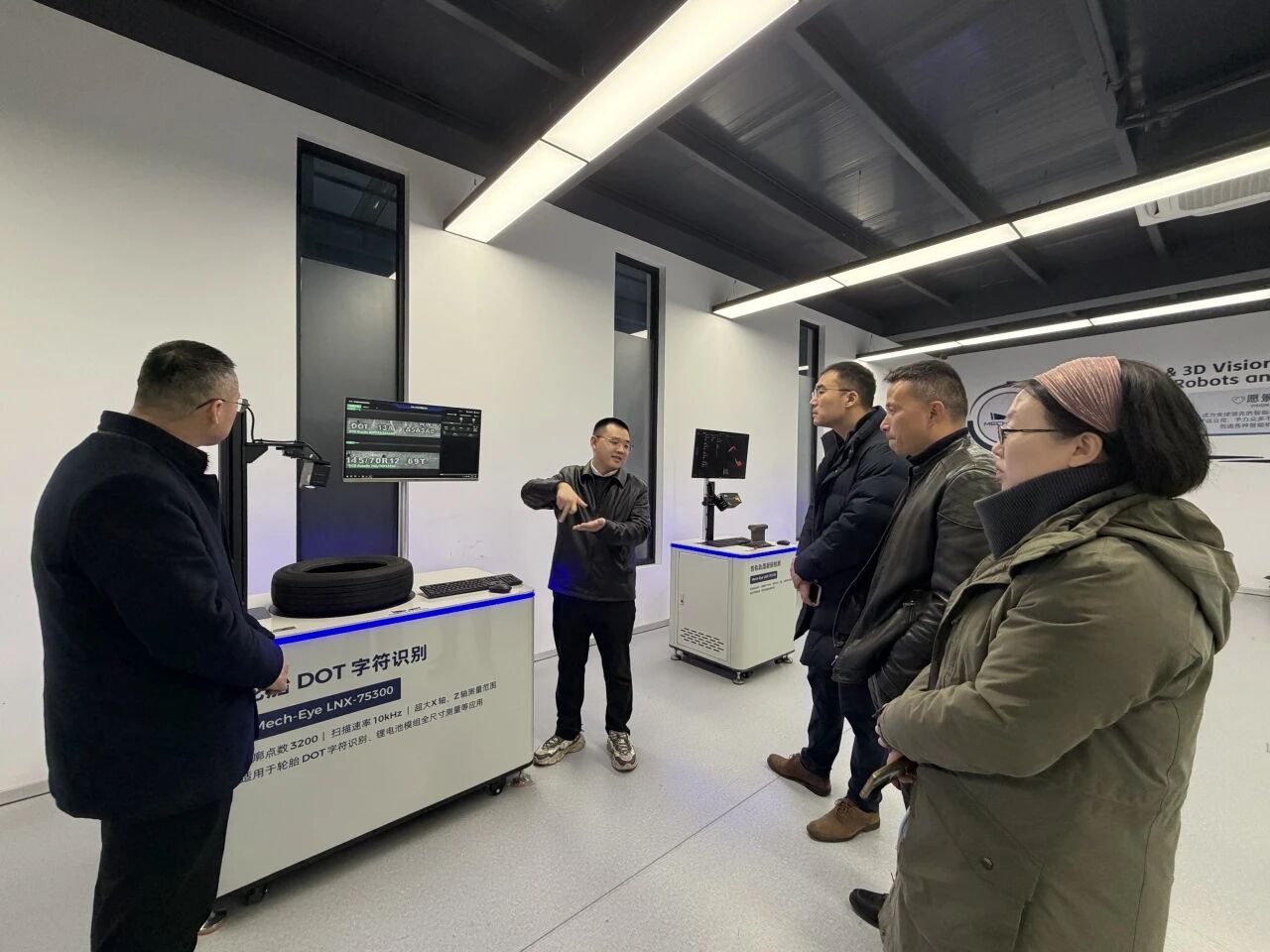 随后,调研团队深入企业技术实验区,实地考察了3D视觉引导系统的实际运作场景。公司工程师现场演示了工业相机参数调试、视觉软件平台操作以及基于视觉算法调用实现工业需求的全流程。特别值得一提的是,梅卡曼德所推广的“无代码编程”模式,让不具备深厚编程背景的操作人员也能快速完成视觉应用部署,这给学院教师在课程设置和实践教学方面带来了新的启发。