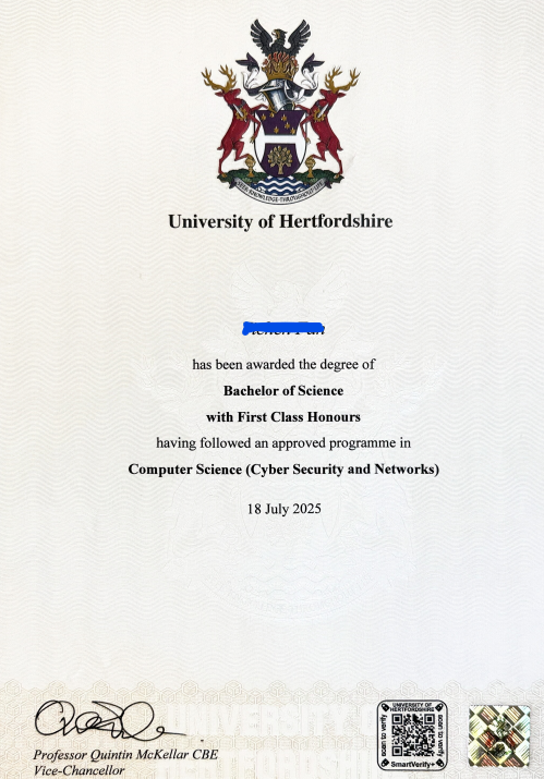 2021级网络工程学生在英国赫特福德大学以First Class Honours成绩毕业,获得英国网络安全与网络本科学位,该学生目前在英国华威大学(University of Warwick)攻读网络安全硕士学位。