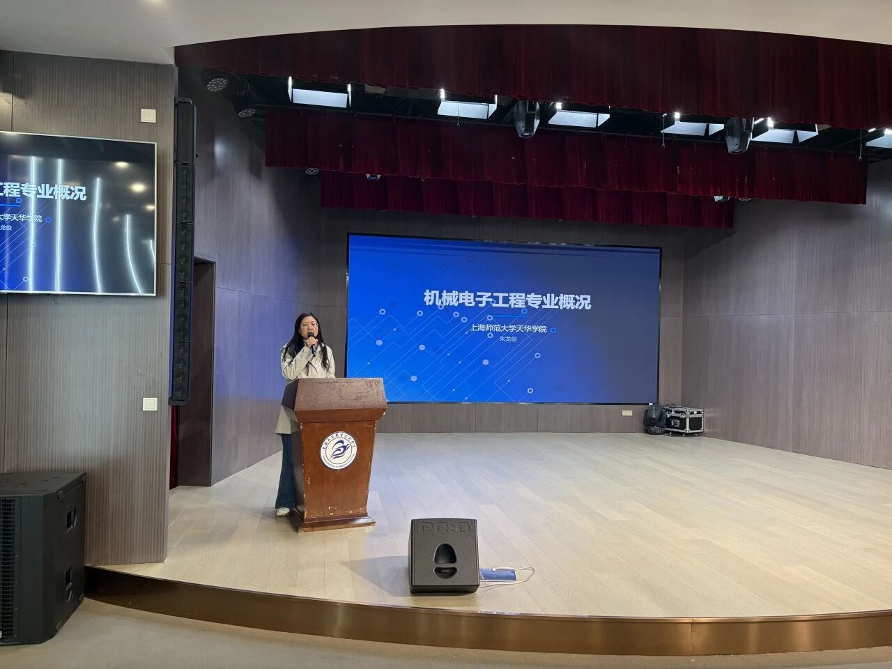 朱龙俊主任则聚焦机械电子工程专业,重点讲解了专业办学条件、校企合作优势及人才培养成效,介绍了学子可参与的埃斯顿工业机器人实训、钛虎机器人等企业真实项目,清晰展现了专业核心竞争力与发展前景。宣讲期间,朱老师还为同学们播放了专属视频,生动展现天华学院学子的真实校园生活——从课堂学习、实验室实训到校园文化活动,全方位呈现其充实鲜活的求学日常,点燃了现场学子的热情,也让大家对天华校园氛围有了直观认知。