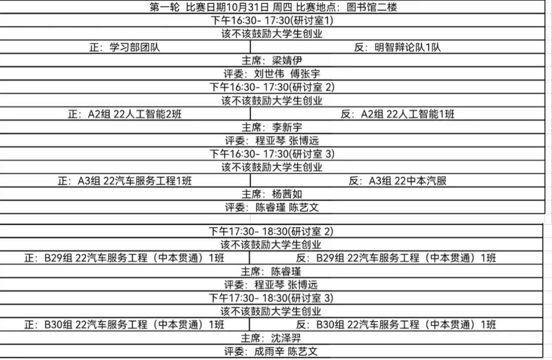 开篇立论环节便火药味十足。如第二场比赛,正方22人工智能2班A2组提出创业可缓解就业压力、助大学生致富等论点,为正方立场奠基。反方22人工智能1班A2组则指出大学生社会经验欠缺、盲目乐观等问题,有力质疑鼓励创业的观点,双方剑拔弩张。