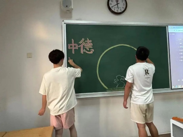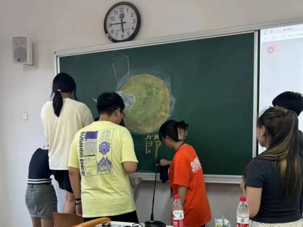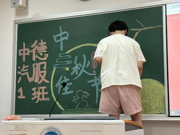 踏入新生班级,仿佛进入了一个充满诗意与温情的中秋世界。班助理们以灵动的笔触和丰富的色彩,在黑板上描绘出了中秋的盛景。黑板报上,一幅幅充满中秋韵味的画卷跃然眼前。班助理们以细腻的笔触勾勒出一轮满月,那圆润的轮廓散发着柔和的光芒,仿佛在诉说着团圆的故事。月亮周围,淡淡的云彩如轻纱般飘动,增添了几分梦幻的色彩。同时,他们在黑板上写下了对新生们的欢迎词和中秋祝福,让新生们感受到了班级的温暖和关爱。
