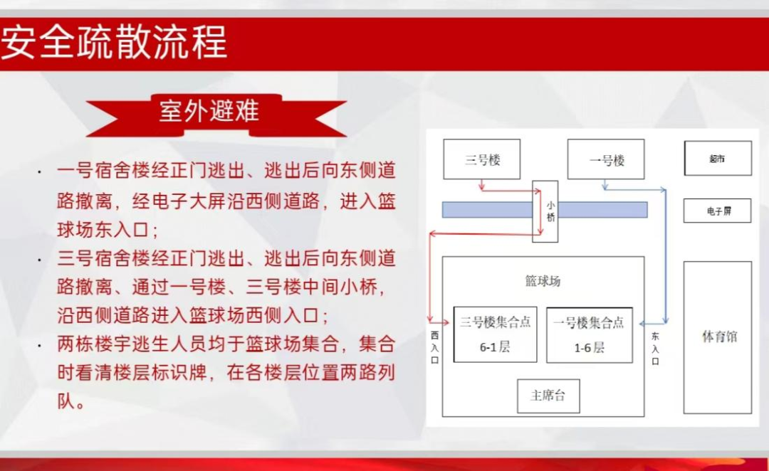 首先,强调疏散路线的选择以及逃生的注意事项。请各位安全员告知本班同学在疏散过程中密切关注台阶,避免奔跑,以防摔倒或发生踩踏事故。此外,由于天气较冷,请各位务必多穿衣物,做好保暖措施。
