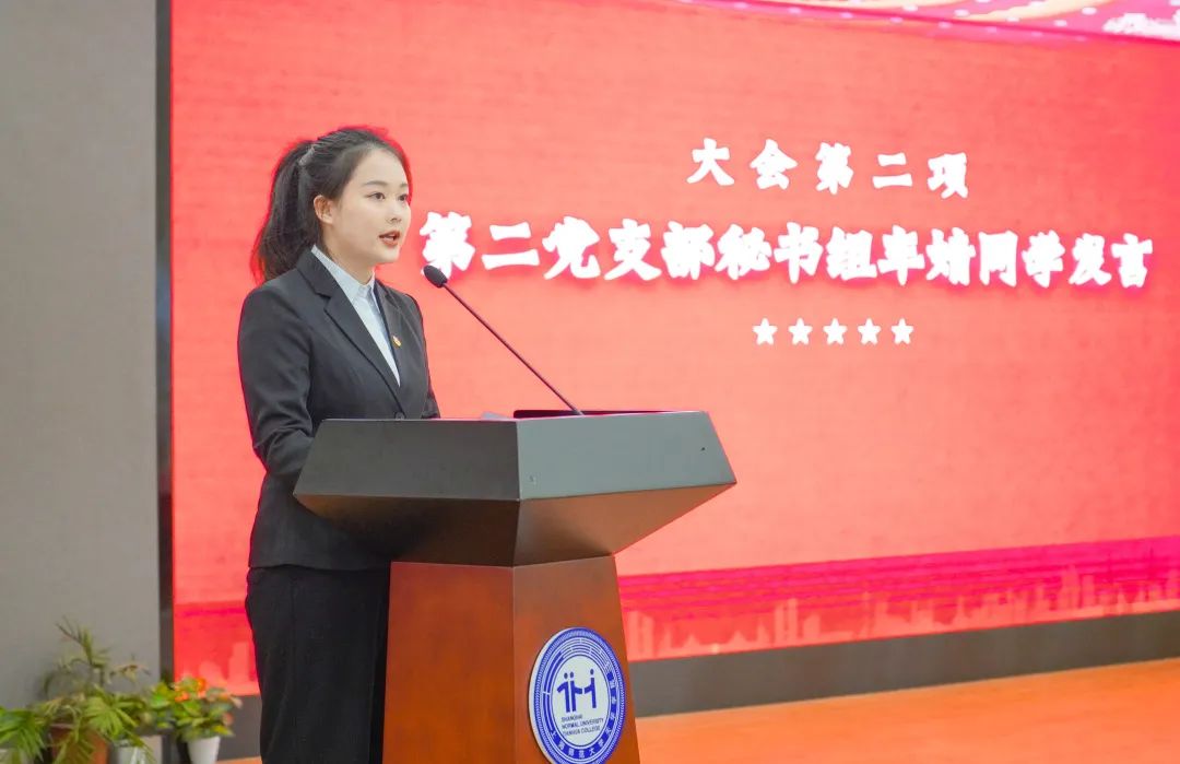 大会第二项议程,由第二党支部秘书组车婧同志发言。车婧同志总结了本学期的学习结对,宿舍结对以及志愿活动等相关情况。进一步提出我们应秉持“实事求是,积极进取”的优良作风,不懈不怠,进一步提高工作质量,充分发挥支部成员的先锋模范作用。车婧同志表示在接下来的学习生活中,第二党支部将继续充分发挥支部成员的先锋模范作用,为全校师生贡献青春力量。