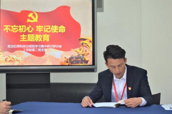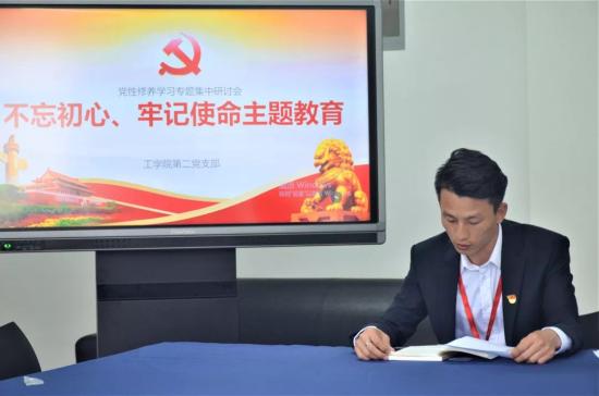 2019年10月15日中午12时,工学院第二党支部于明华楼460会议室召开了“不忘初心,牢记使命”主题教育研讨会,本次会议由工学院第二支部书记权友良老师主持,李婉璐老师、王晓亮老师以及第二支部全体学生党员、入党积极分子参加了本次研讨会。