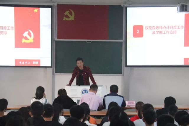 首先,党建中心指导老师权友良对月度工作进行了点评。权友良老师首先指出了工学院党建工作中暴露出的问题并提出了相应的整改措施和要求,随后,他对接下来的党建工作进行了安排部署,为大家介绍了垃圾分类工作的具体措施,还强调了党建中心对寝室进行结对帮扶的重要性,并对以上两项工作向党建中心的全体成员提出了相关的工作要求。