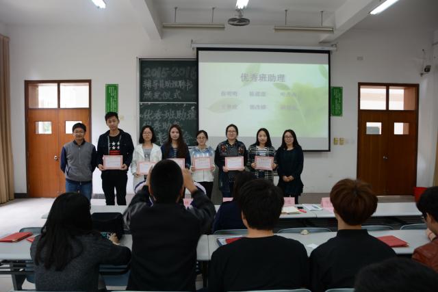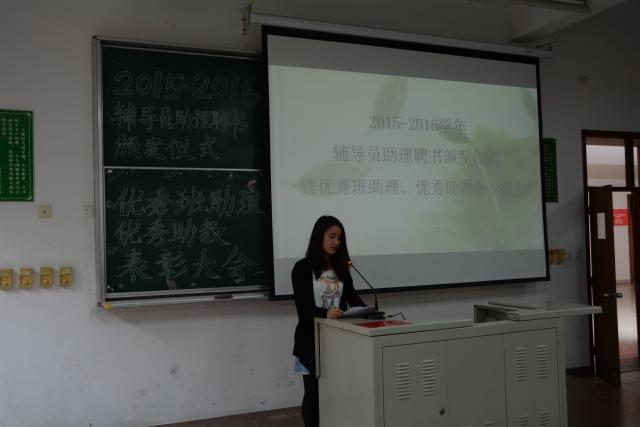 聘书颁发仪式暨表彰大会在一片热烈而整齐的掌声中开场,首先我们聆听了辅导员助理代表张春合的发言,他与我们分享了在他就职辅导员助理期间所收获的心得与感悟,朴实真挚的话语让在座的同学都感同身受。紧接着是班助理代表郭改娣和学生助教代表张丽媛发言,他用自己的实际经历,告诉我们他在助教时期得到了成长,在教导他人的同时自己也收获了很多。在正式向2015-2016学年辅导员助教颁发聘书和颁发优秀班助理、助教荣誉证书之后,党总支总书记刘香连进行了简短却满含深意的讲话,让我们明白了这份职责的意义所在。相信大家都在此次仪式中受益匪浅,聘书颁发仪暨表彰大会式圆满结束。