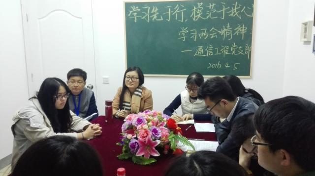 为进一步提高通信工程党支部内党员们的党性觉悟与修养,令我们更清楚作为一名大学生党员当下该做的事,以便日后在日常学习中自觉实践两会精神,履行自己应尽的义务,积极发挥好带头作用,我工学院通信工程党支部于2016年4月5日晚8点在4号楼130党员工作站进行了学习两会精神交流会。参加本次会议的有通信工程党支部书记金玫老师,支部副书记牛风学老师及通信支部全体党员和积极分子。