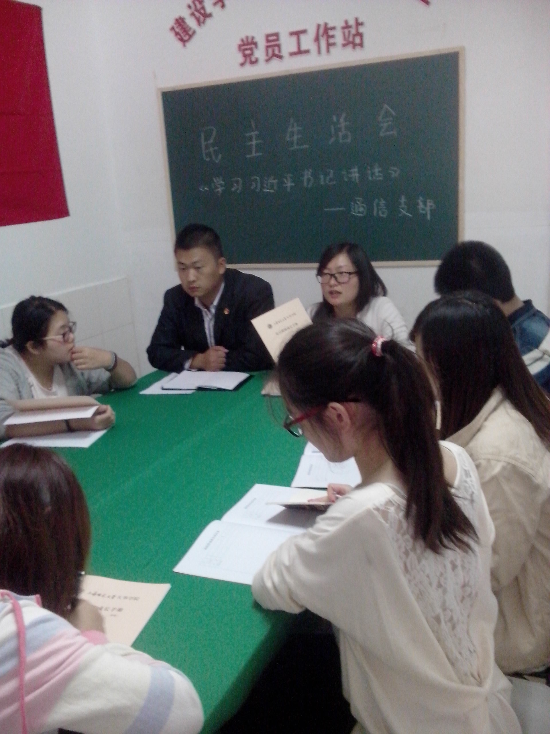 2014年10月22日我工学院通信工程党支部于我院党员工作站活动基地组织召开了专题学习会——学习《习近平在党的群众路线教育实践活动总结大会上的讲话》会议精神。与会的有通信工程党支部书记金玫老师、副书记彭刘刚老师以及13名支部党员、入党积极分子。