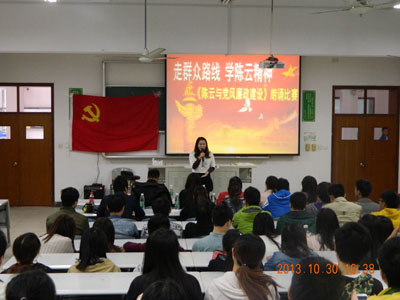 2013年10月30日下午16时30分于日阶103,我校工学院组织举办了“走群众路线,学陈云精神”《陈云与党风廉政建设》朗诵比赛。莅临本次比赛的领导有天华学院校党委书记韩晓玉,工学院党总支书记刘香连,工学院党总支副书记王慧荣、赵科,工学院通信工程专业党支部书记金玫以及各班辅导员。比赛由12级汽服1班江萧同学担任主持。