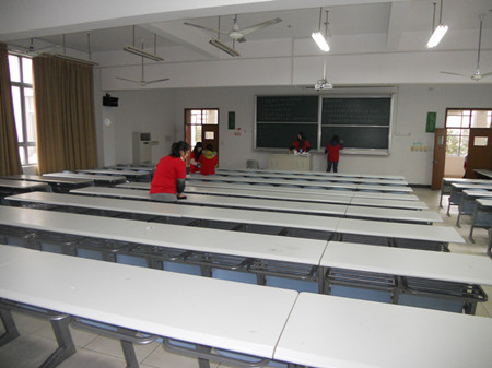 一进教室,同学们纷纷行动起来,擦黑板,擦桌面,扫地,拖地,清洗窗户,讲台。谁都不甘落后,虽然此时春寒料峭,但教室中却是一片热火朝天的气氛。在近一个小时活动之后,日华楼的20间阶梯教室都给人以焕然一新的感觉。