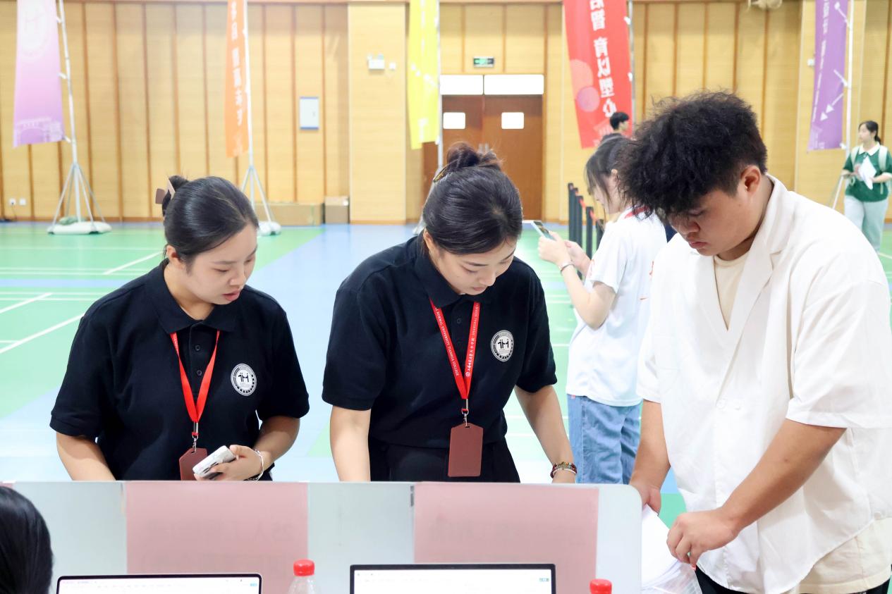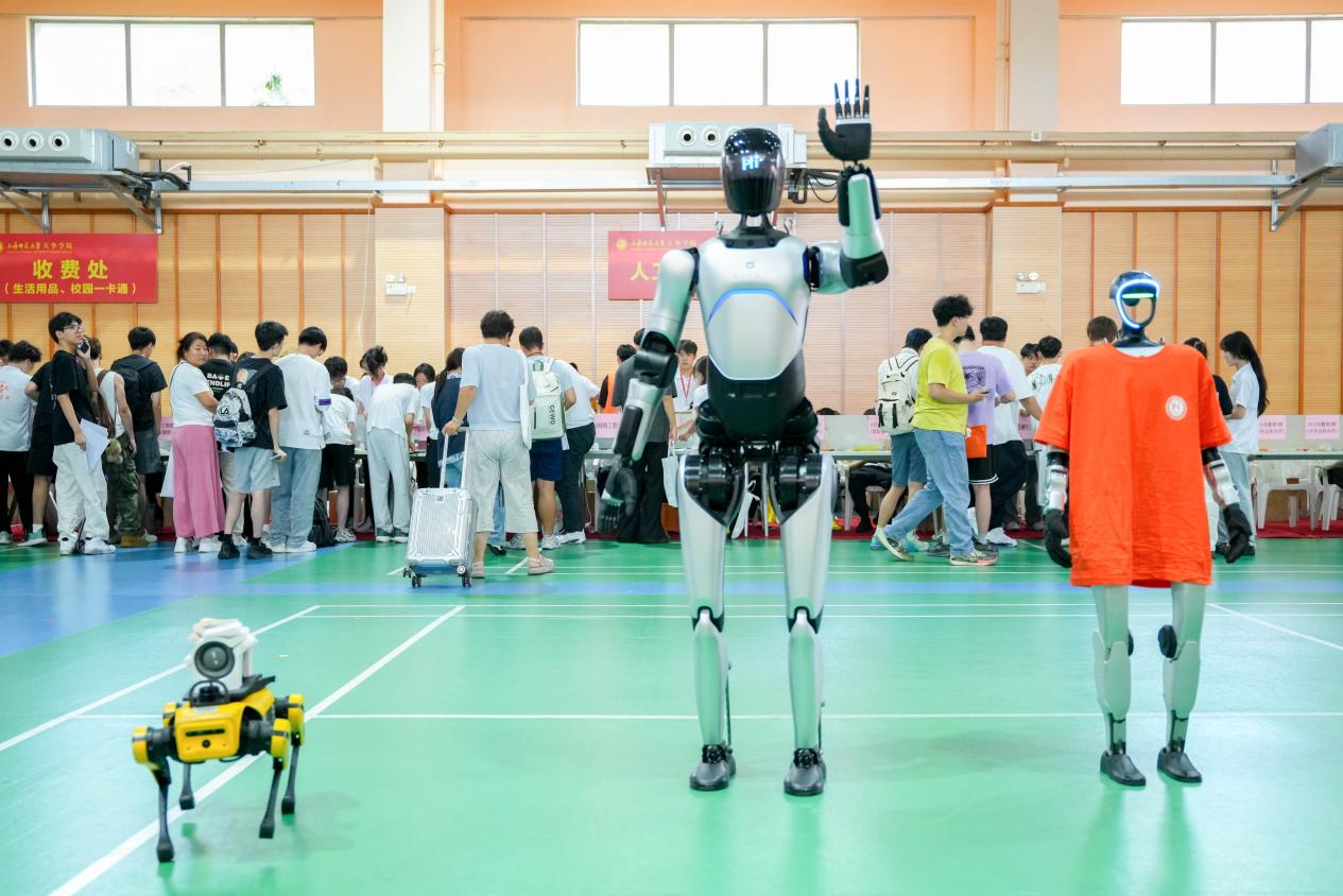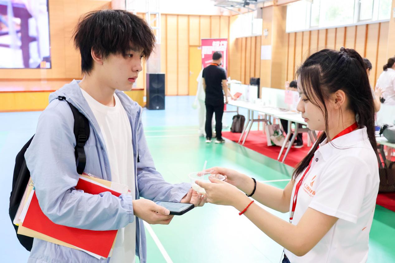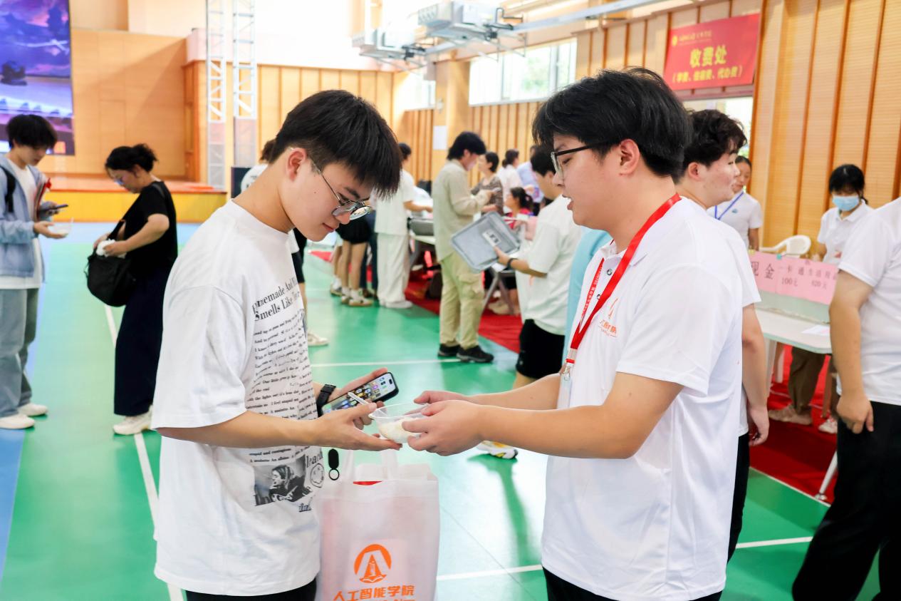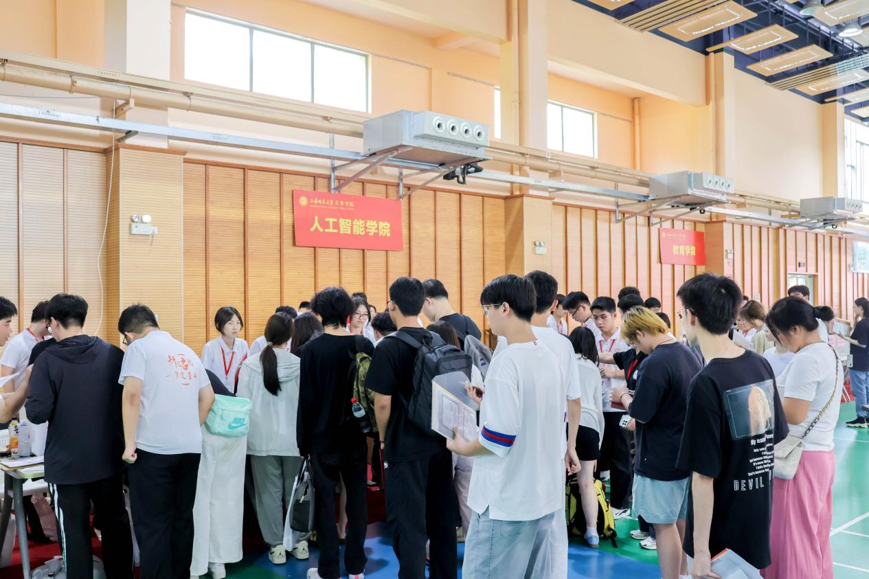 07:30,体育馆中人工智能学院的迎新阵地已严阵以待。学院在烈日下为远道而来的家长和新生们准备了清热解暑的刨冰,不仅尽量缩短报到时间,还贴心考虑每位同学的需求。班助理们以最佳状态迎接学弟学妹,同时还有ai机器人的热烈欢迎和ai机器狗对学院的详细介绍,让新生们从刚入学就可以体会到人工智能学院的学院特色,老师与班助理们通过“一站式”便捷服务为家长和新生们提供便利。从身份核验、档案提交到宿舍分配,各环节均采用“流水线”作业模式,新生辅导员全程驻点,实时解答新生们的各种问题。