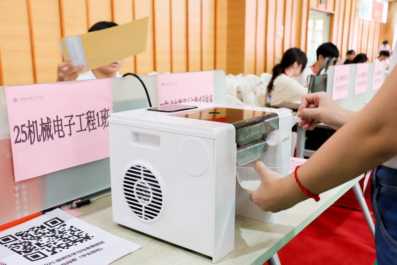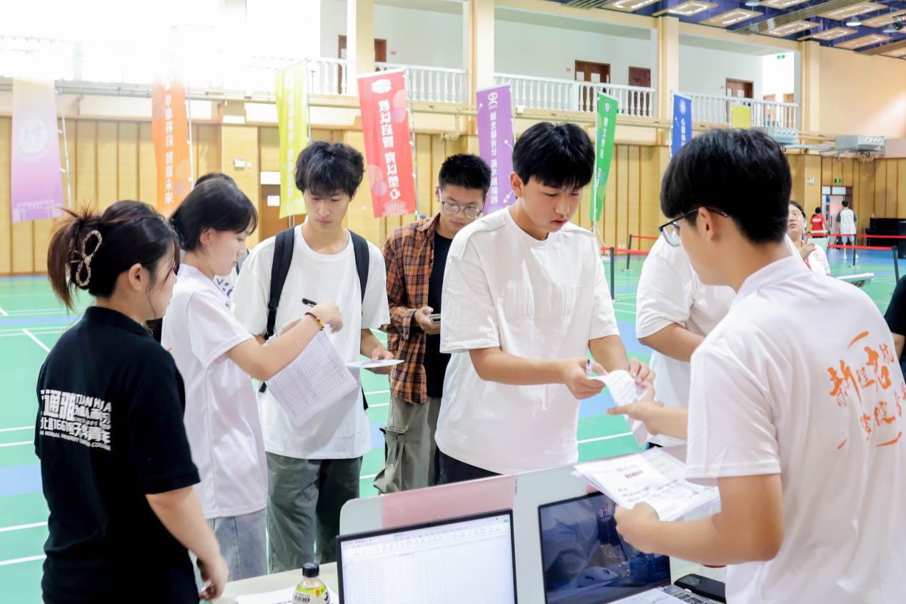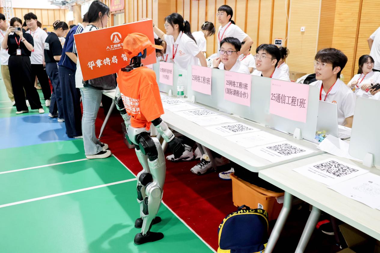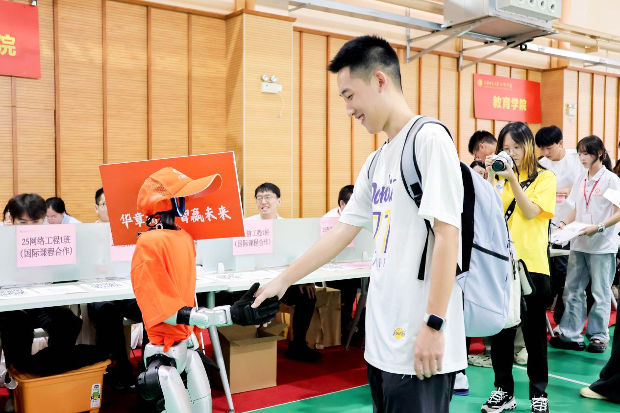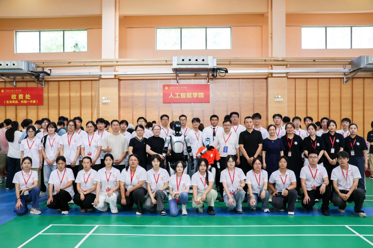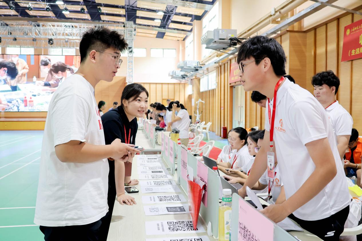 07:30,体育馆中人工智能学院的迎新阵地已严阵以待。学院在烈日下为远道而来的家长和新生们准备了清热解暑的刨冰,不仅尽量缩短报到时间,还贴心考虑每位同学的需求。班助理们以最佳状态迎接学弟学妹,同时还有ai机器人的热烈欢迎和ai机器狗对学院的详细介绍,让新生们从刚入学就可以体会到人工智能学院的学院特色,老师与班助理们通过“一站式”便捷服务为家长和新生们提供便利。从身份核验、档案提交到宿舍分配,各环节均采用“流水线”作业模式,新生辅导员全程驻点,实时解答新生们的各种问题。