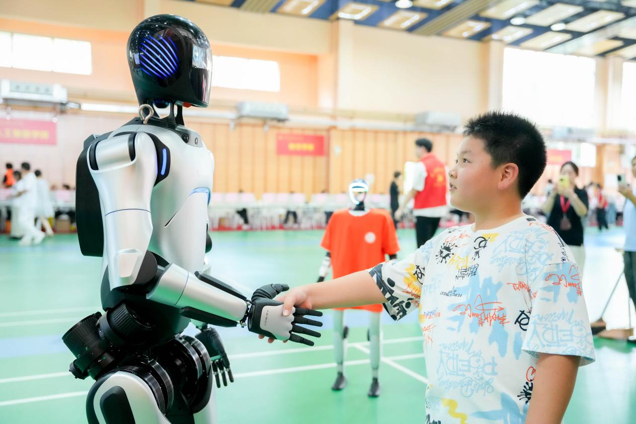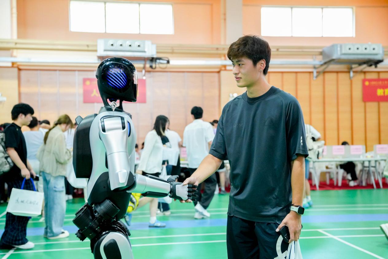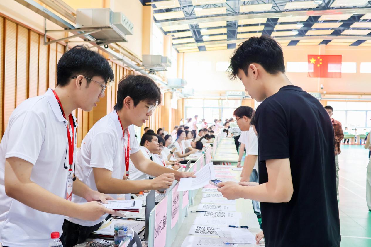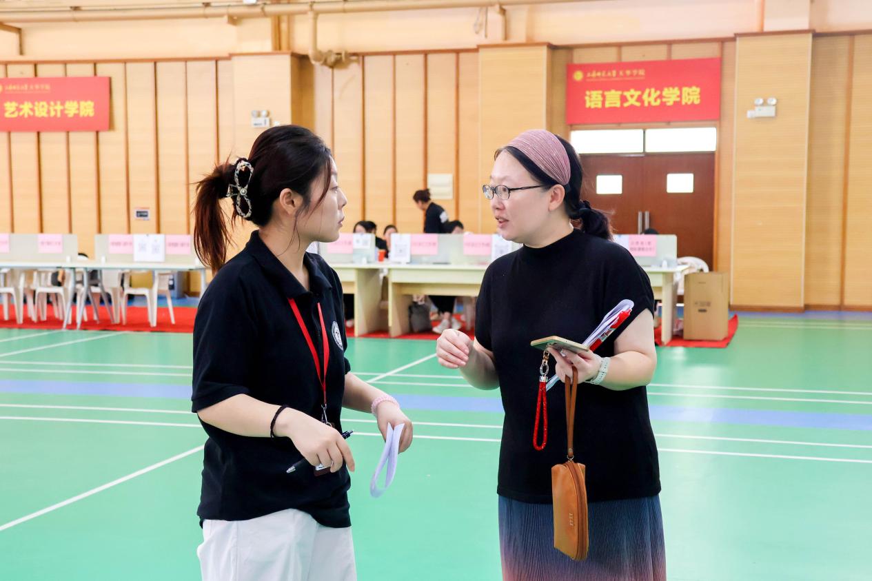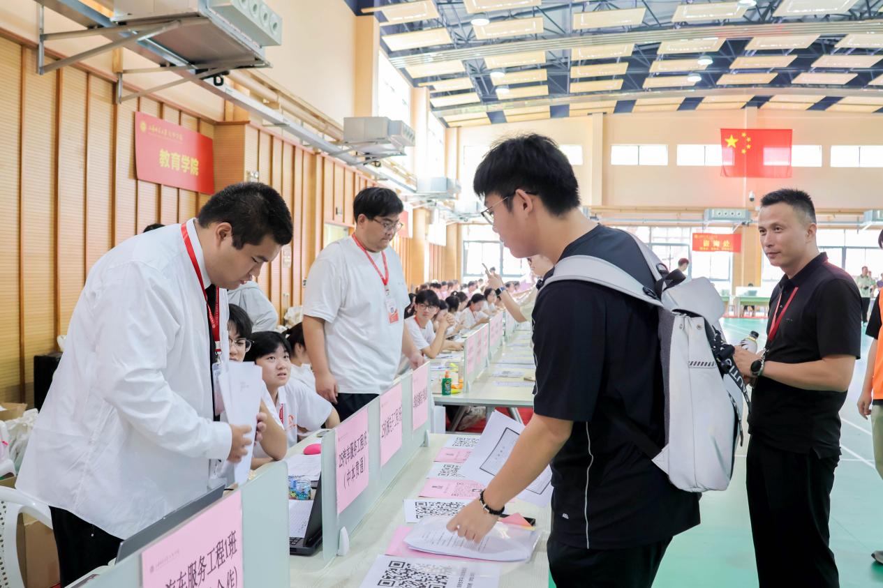 07:30,体育馆中人工智能学院的迎新阵地已严阵以待。学院在烈日下为远道而来的家长和新生们准备了清热解暑的刨冰,不仅尽量缩短报到时间,还贴心考虑每位同学的需求。班助理们以最佳状态迎接学弟学妹,同时还有ai机器人的热烈欢迎和ai机器狗对学院的详细介绍,让新生们从刚入学就可以体会到人工智能学院的学院特色,老师与班助理们通过“一站式”便捷服务为家长和新生们提供便利。从身份核验、档案提交到宿舍分配,各环节均采用“流水线”作业模式,新生辅导员全程驻点,实时解答新生们的各种问题。