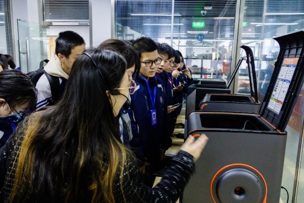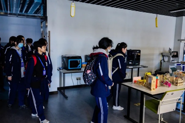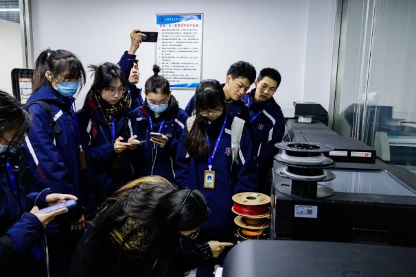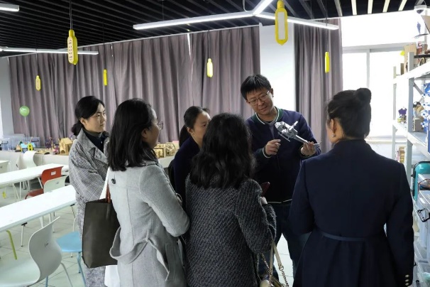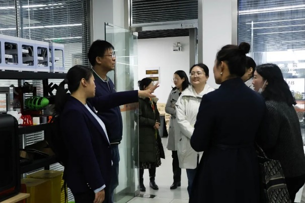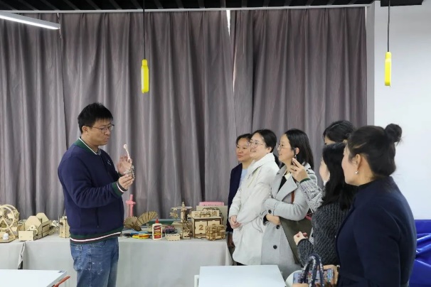 午餐休息后,双方移步至鑫华楼。天华学院人工智能学院的李忠唐老师向工商外国语学院的领导们展示了学生们精心制作的作品,并介绍了学校先进的硬件设施,如激光切割机、3D打印机等,让工商外国语学院的领导们对天华学院的人工智能教学成果有了直观而深刻的认识。