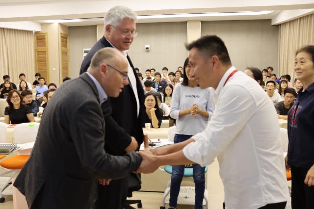 会议第三项为德国手工业协会总裁Malcherek发言致词。Malcherek先生开篇介绍了中德合作专业学生前往的手工业协会的学习场所的大致情况,表示德国老师将会对学生进行汽车修理、维护等方面的专业指导,并会根据学生的学习情况对学生进行测试,根据各位学生的相应成绩颁发证书。随后,Malcherek先生提出了德国手工业协会与中国各大高校都有过合作,拥有丰富的国际合作教学经验,同时Malcherek先生还强调了由德国手工业协会颁发的证书含金量非常高,无论是在国内还是国外,其认可度都是有口皆碑。最后,Malcherek先生向大家声明德国手工业协会在教学上不仅注重学生对于专业知识的学习,更重视学生的动手实践能力。
