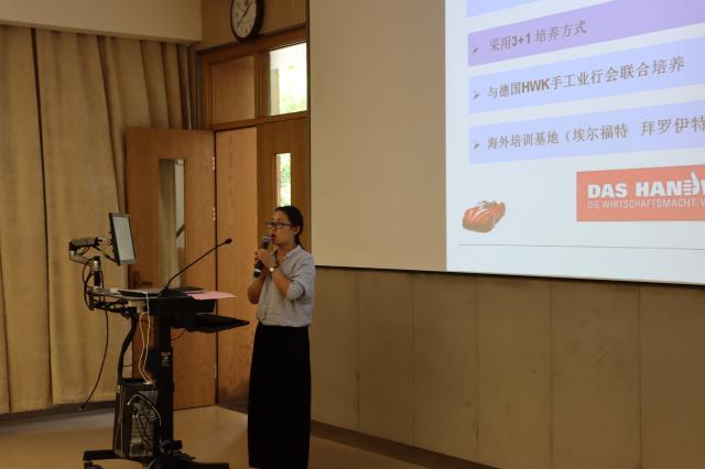 会议第二项为专业主任石玲介绍汽车服务工程专业及中德合作项目建设情况。石玲老师从设置时间、招生规模、培养目标、师资队伍四方面介绍了工学院的汽车服务工程专业,接着石玲老师从多方面介绍了中德合作优势,并向大家展示了汽服专业学生的学习成果及发展前途。最后,石玲老师向大家介绍了汽服专业优秀的教学理念以及在这一领域获得的丰硕成就。
