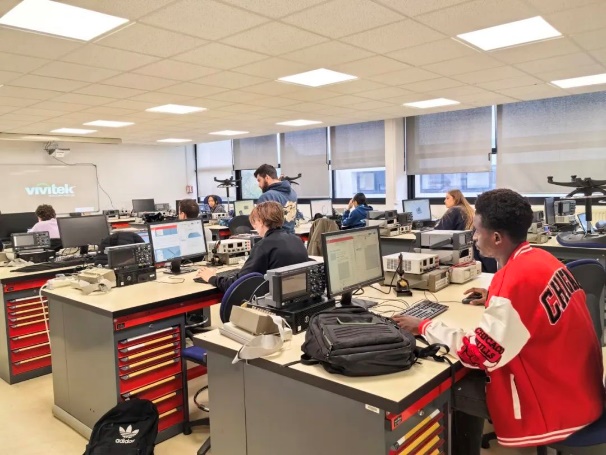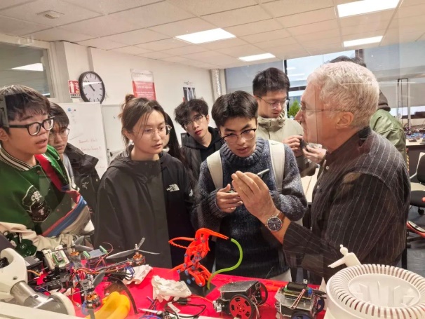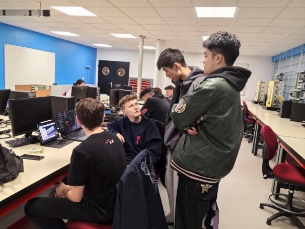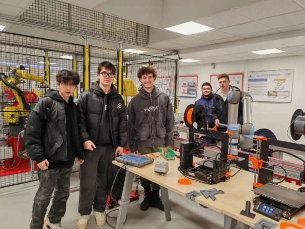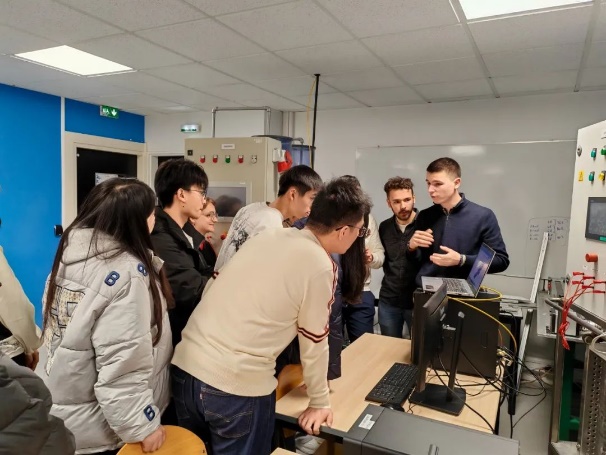 紧接着的机器人技术专业课程更是精彩绝伦。在机器人实训室,Gomez教授巧妙分组,10位同学分到了五个小组当中,同学们与法国本地学生携手合作,围绕感兴趣的课题展开项目开发,包括末端执行器设计、机械臂控制、智能小车控制、水箱液位及温度PLC控制、智能制造生产线控制。不同文化背景与思维方式的碰撞,激发了创新的火花。大家热烈讨论,积极实践,为优化设备性能各抒己见,在跨文化合作中不断提升专业技能与团队协作能力。