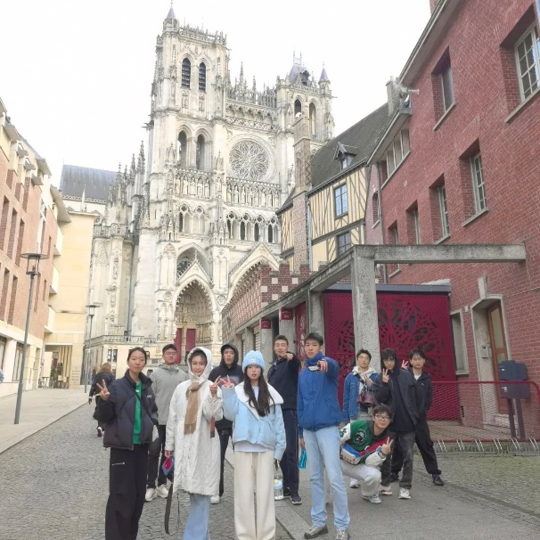 初抵法国,UniLaSalle Amiens 便以热忱与贴心迎接远方来客。一位热情的中国留学生志愿者担当向导,引领师生漫步亚眠的大街小巷,熟悉周边环境并探寻通往校园的路径。途中,那座始建于 1220 年的亚眠大教堂映入眼帘,它宛如一座艺术与历史的丰碑,哥特式建筑的尖顶直插云霄,宏伟壮丽的外观诉说着岁月的沉淀。师生们沉浸其中,不仅为建筑艺术之美所折服,更在心底种下了对法国深厚历史文化敬畏与探索的种子。