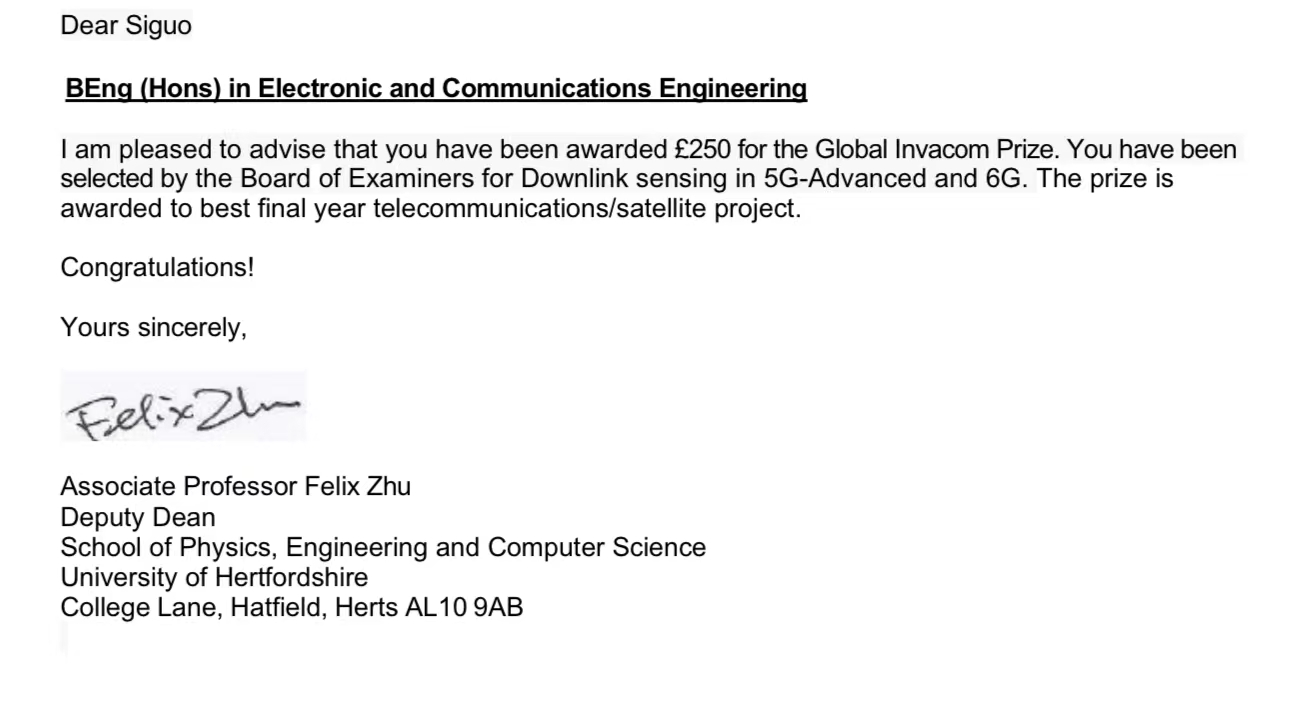 许思果同学参加我校与英国赫特福德大学的国际课程合作项目,于2023年前往英国就读本科的第四年,并完成本科毕业设计。优秀毕业设计奖的颁发者Global Invacom Group是一家国际通信集团公司,与众多国际知名高校合作,还设立学生奖励机制,从中选拔优秀通信类毕业生。许思果同学的毕业设计能够在众多工程类毕业设计中脱颖而出,离不开许思果同学的努力钻研,也倾注了母校老师们的关心与帮助。