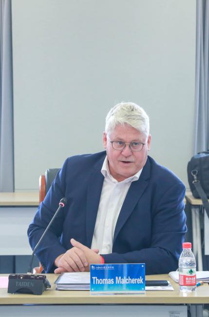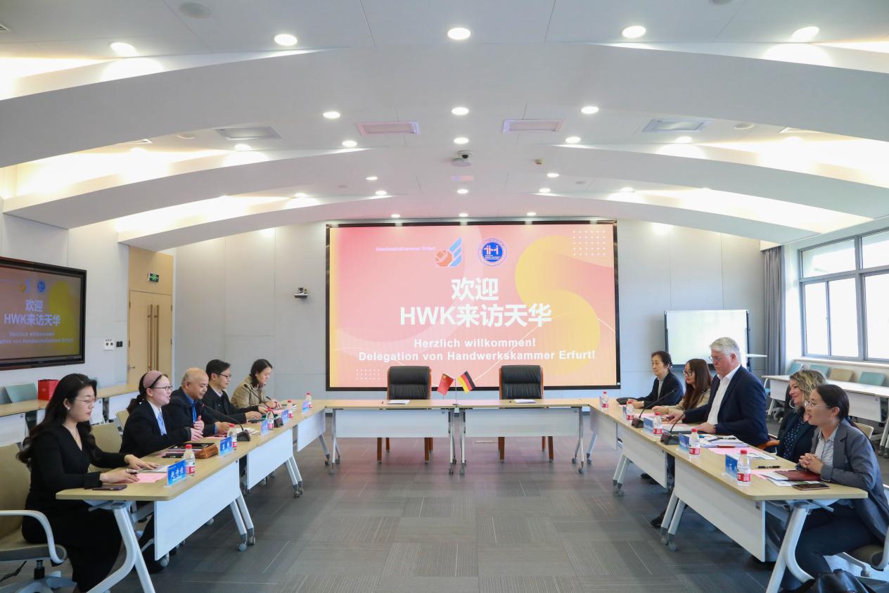 会议第四项是由HWK总裁Thomas Malcherek为我们详细叙述了HWK Erfurt所在位置,是一家拥有14039家会员企业,69500名员工,3216名学徒的大型行业协会,拥有良好的实训条件,实行实训与考证联合运作模式,是德国“双元制”人才培养模式的发源地和欧洲职业培训最高标准的制定者,具有丰富的国际合作办学经验,在中国已经拥有20年的合作经验,与政府和高校均有合作。总裁希望能够加强与天华的深入合作,交流互鉴,共同拓宽国际化合作办学之路。